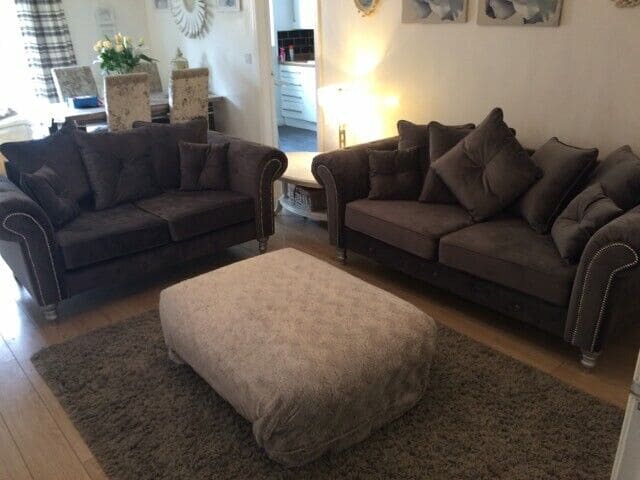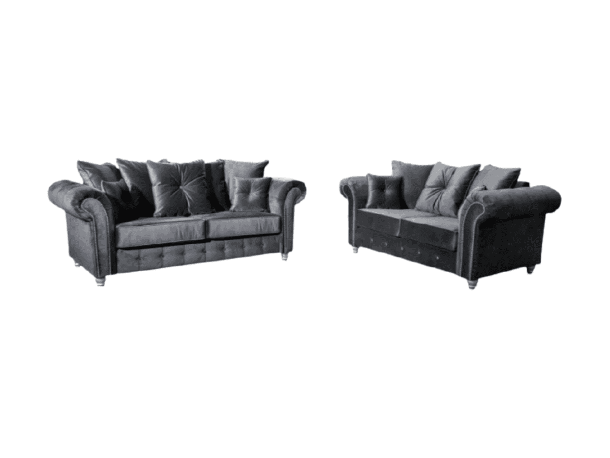 Our Olympia (3+2) sofa set features chrome studded arms and back. This luxury design has been completed to provide elegancy with its chesterfield styled pushed buttons. The design came directly from feedback from our customers. We provide this sofa in a beautiful charcoal plush fabric, contrasted by the silver-toned studs. They give the sofa a beautiful traditional style. Comfort is something we have specifically focused on. This Olympia(3+2) sofa set is a scatter-back option which will keep you cozy.